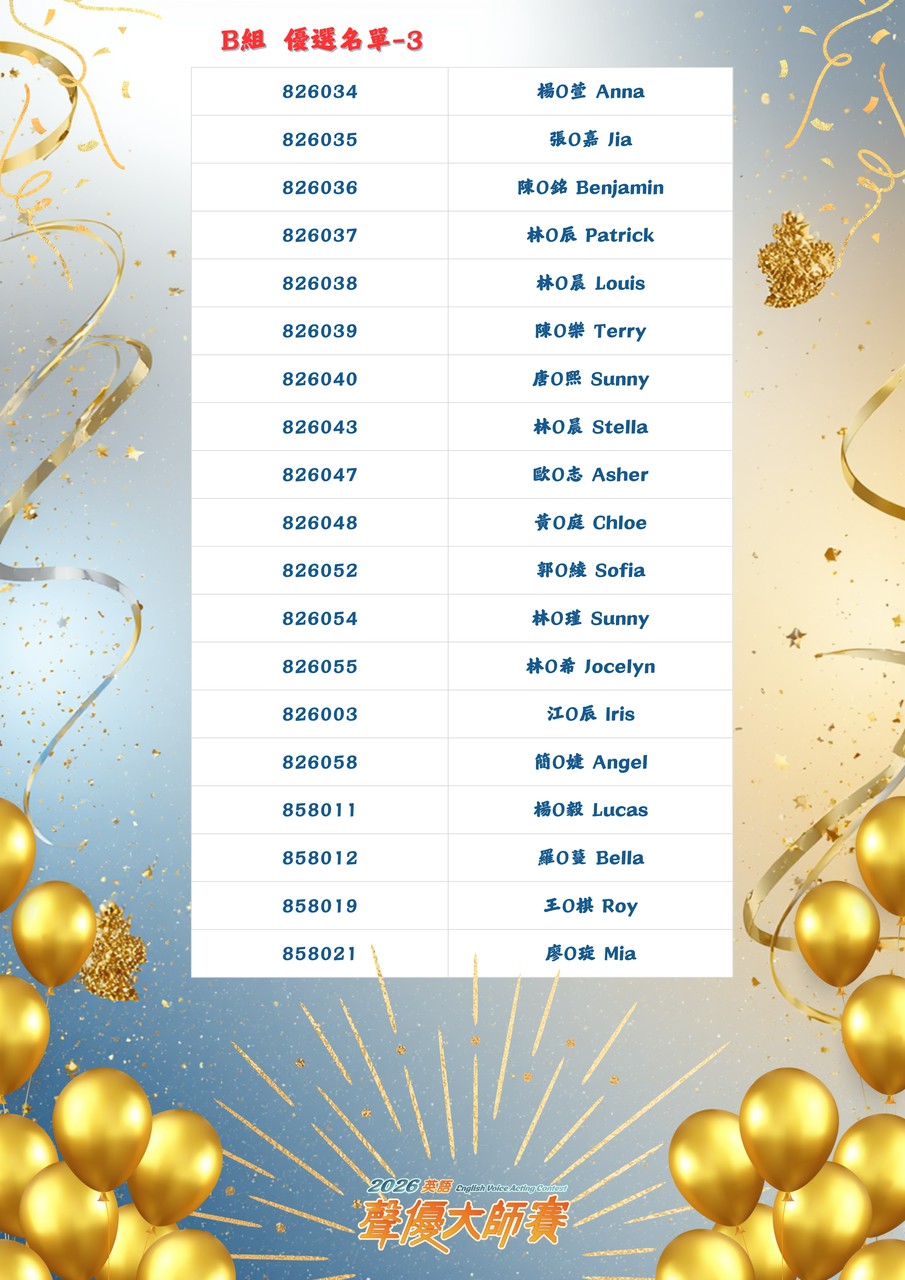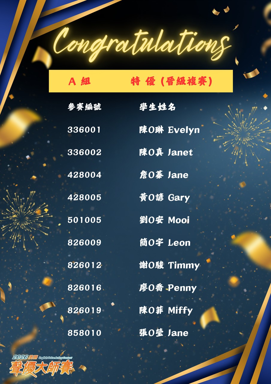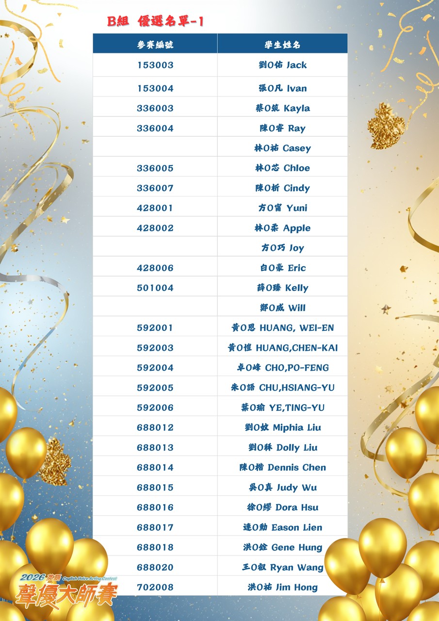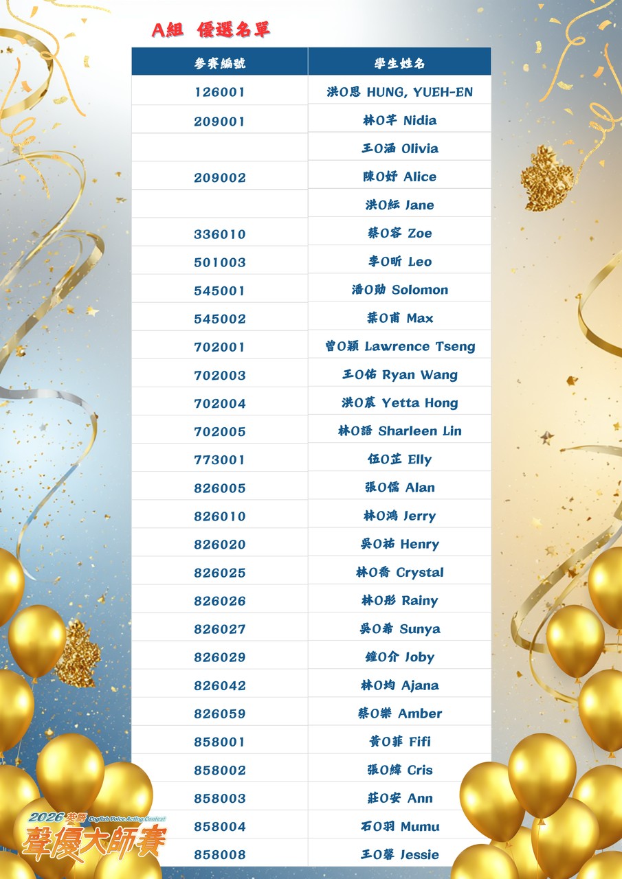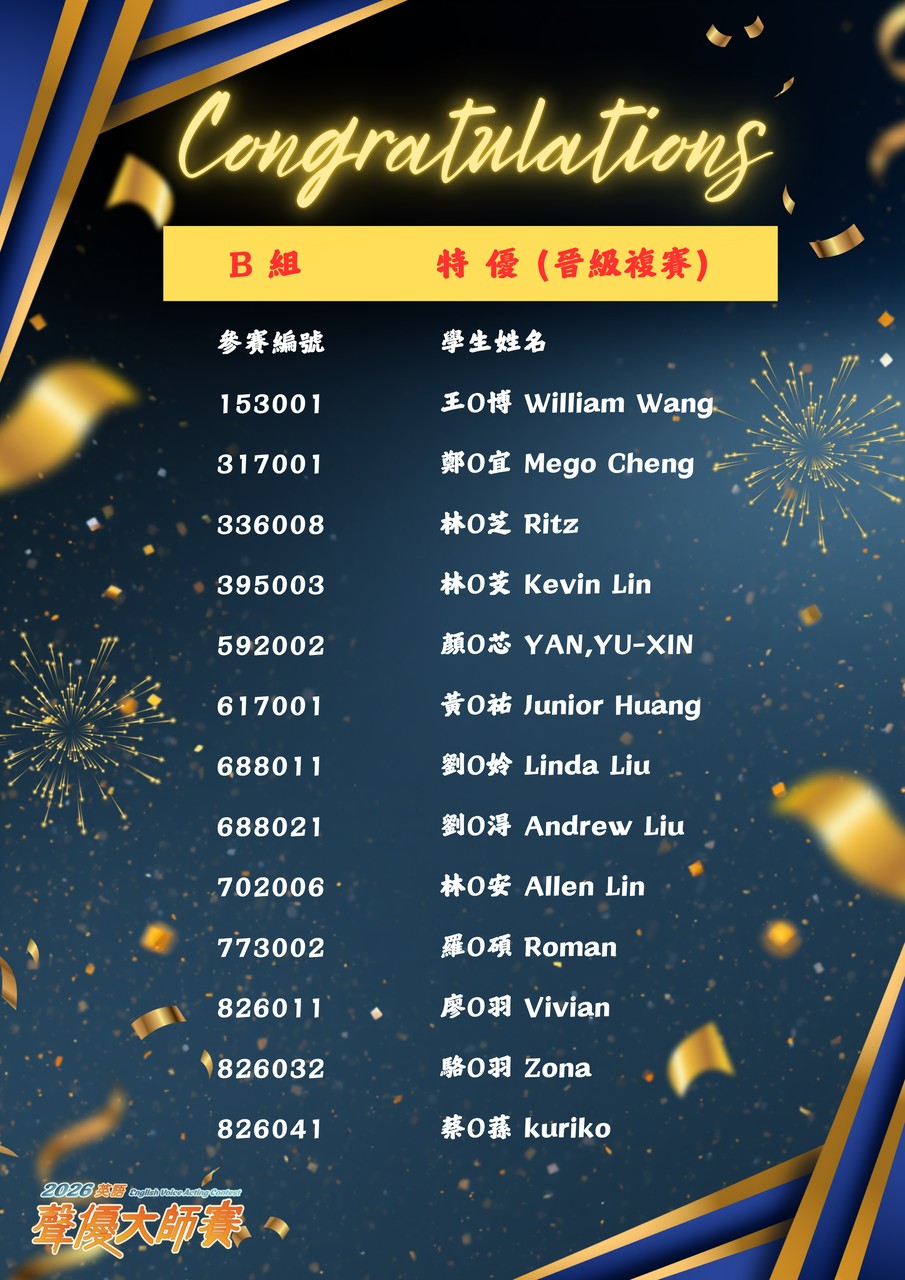 【2026 英語聲優大師賽】「初賽」結果公告 New!!